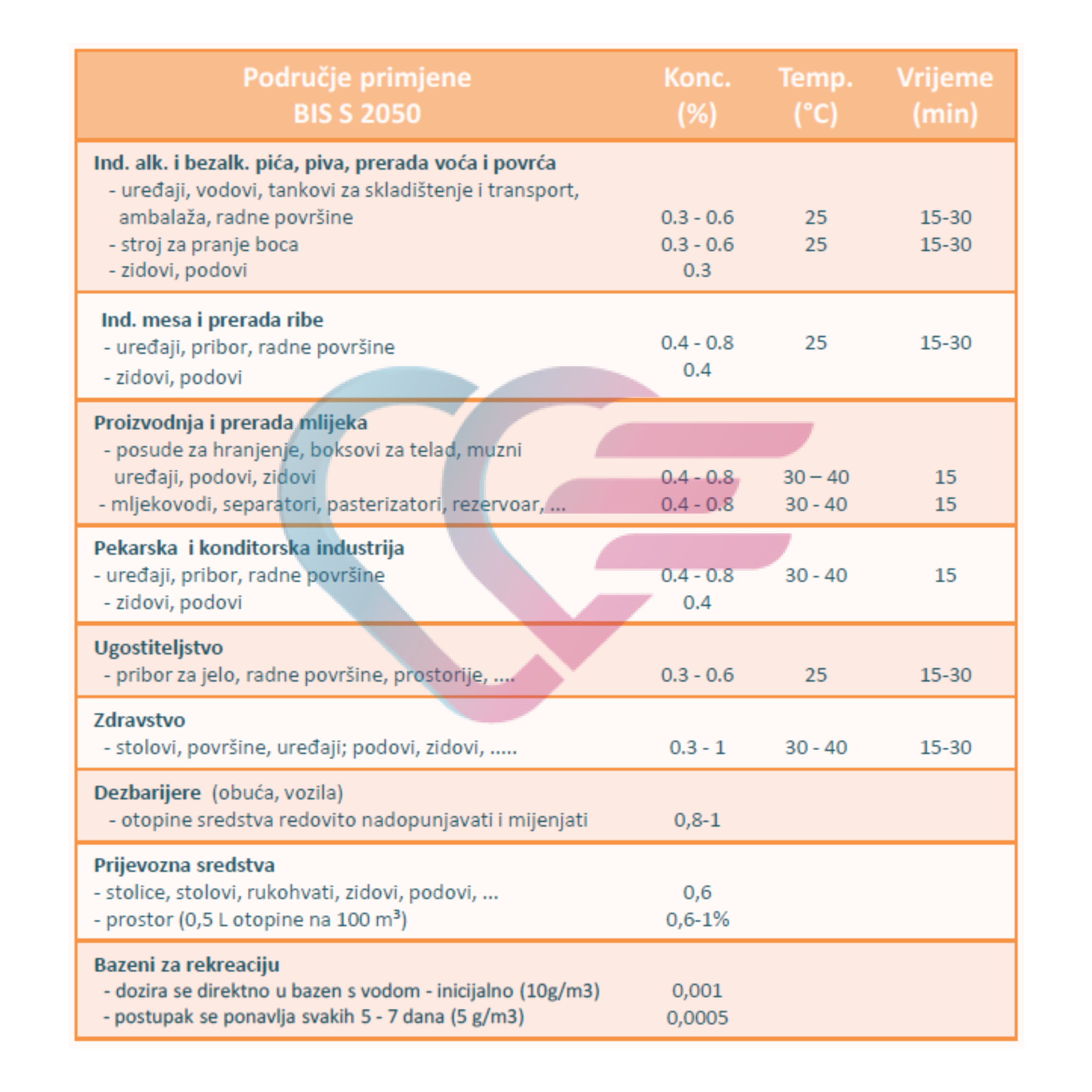 - Primjenjuje se ručno i strojno (potapanjem, prskanjem) u koncentraciji 0,2-1 % na temperaturi do 40 °C i u vremenu 15-30 minuta.